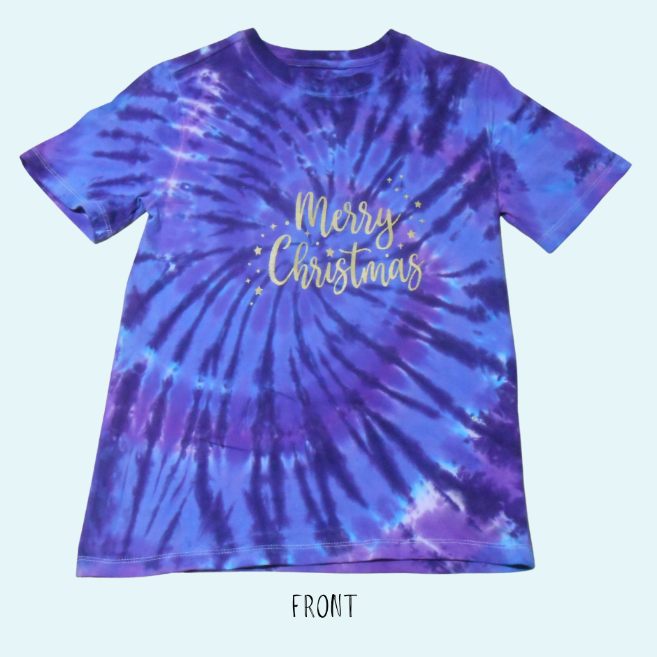 This unique, hand-dyed tee features vibrant shades of Grape, Blue Violet, and Deep Purple, with a gold “Merry Christmas” printed across the front!